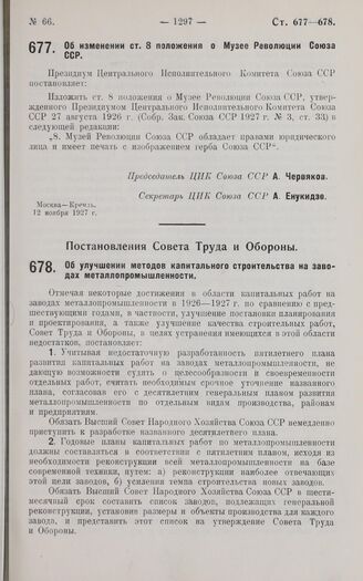 Постановление Президиума Центрального Исполнительного Комитета. Об изменении ст. 8 положения о Музее Революции Союза ССР. 12 ноября 1927 г.