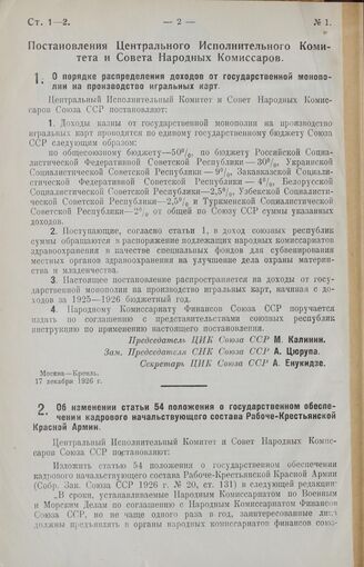 Постановление Центрального Исполнительного Комитета и Совета Народных Комиссаров. О порядке распределения доходов от государственной монополии на производство игральных карт. 17 декабря 1926 г.