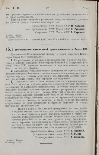 Постановление Центрального Исполнительного Комитета и Совета Народных Комиссаров. О регулировании мукомольной промышленности в Союзе ССР. 17 декабря 1926 г.