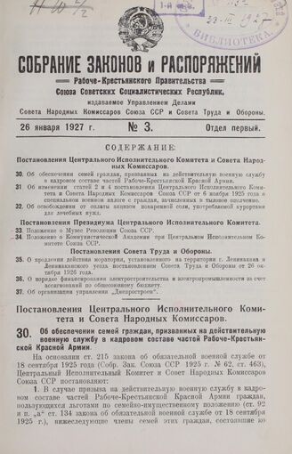 Постановление Центрального Исполнительного Комитета и Совета Народных Комиссаров. Об обеспечении семей граждан, призванных на действительную военную службу в кадровом составе частей Рабоче-Крестьянской Красной Армии. 31 декабря 1926 г.