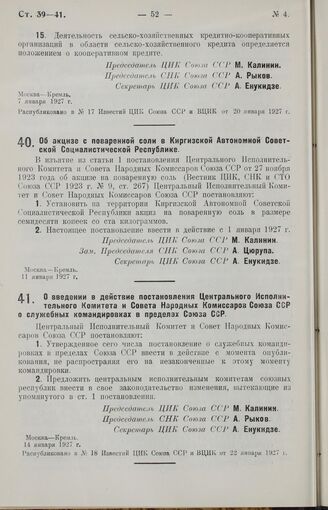 Постановление Центрального Исполнительного Комитета и Совета Народных Комиссаров. Об акцизе с поваренной соли в Киргизской Автономной Советской Социалистической Республике. 11 января 1927 г.