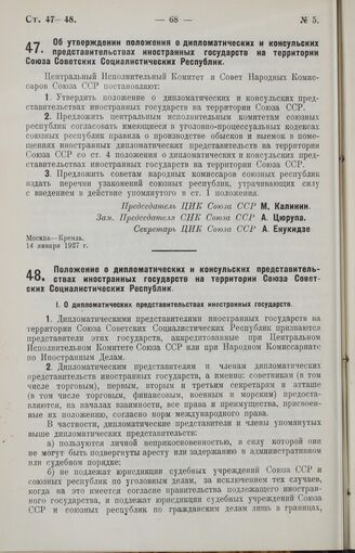Постановление Центрального Исполнительного Комитета и Совета Народных Комиссаров. Положение о дипломатических и консульских представительствах иностранных государств на территории Союза Советских Социалистических Республик. 14 января 1927 г.