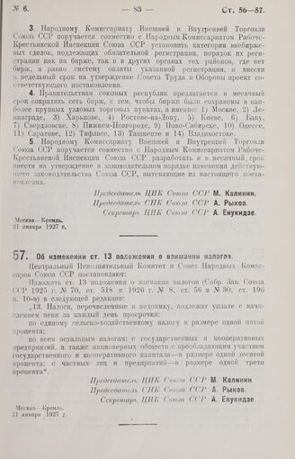 Постановление Центрального Исполнительного Комитета и Совета Народных Комиссаров. Об изменении ст. 13 положения о взимании налогов. 21 января 1927 г.