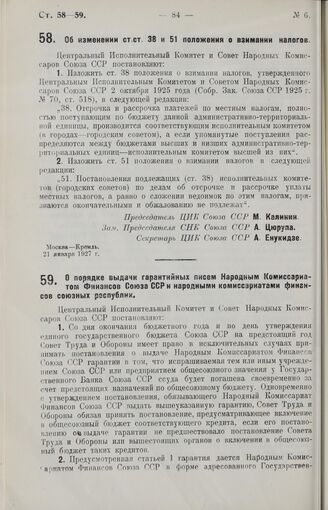 Постановление Центрального Исполнительного Комитета и Совета Народных Комиссаров. Об изменении ст. ст. 38 и 51 положения о взимании налогов. 21 января 1927 г.