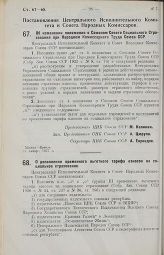 Постановление Центрального Исполнительного Комитета и Совета Народных Комиссаров. Об изменении положения о Союзном Совете Социального Страхования при Народном Комиссариате Труда Союза ССР. 14 января 1927 г.