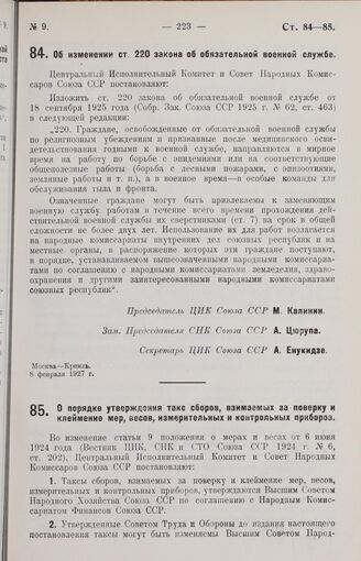 Постановление Центрального Исполнительного Комитета и Совета Народных Комиссаров. Об изменении ст. 220 закона об обязательной военной службе. 8 февраля 1927 г.