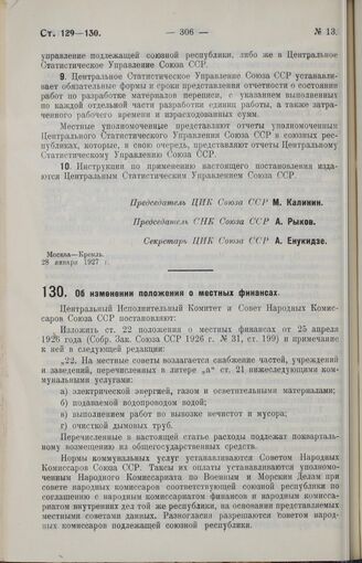 Постановление Центрального Исполнительного Комитета и Совета Народных Комиссаров. Об изменении положения о местных финансах. 4 марта 1927 г.
