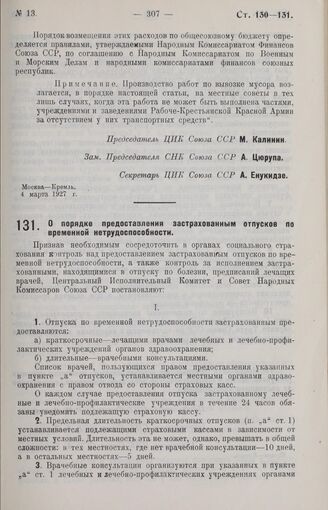 Постановление Центрального Исполнительного Комитета и Совета Народных Комиссаров. О порядке предоставления застрахованным отпусков по временной нетрудоспособности. 4 марта 1927 г.