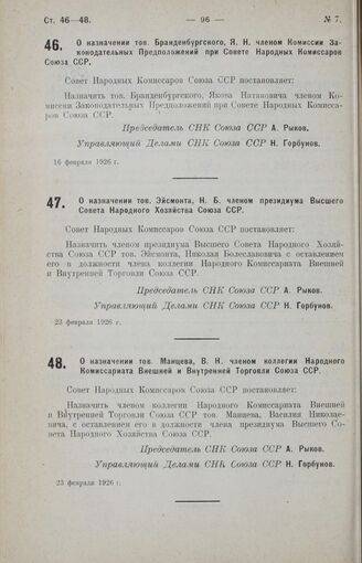 О назначении тов. Бранденбургского, Я. Н. членом Комиссии Законодательных Предположений при Совете Народных Комиссаров Союза ССР. 16 февраля 1926 г.