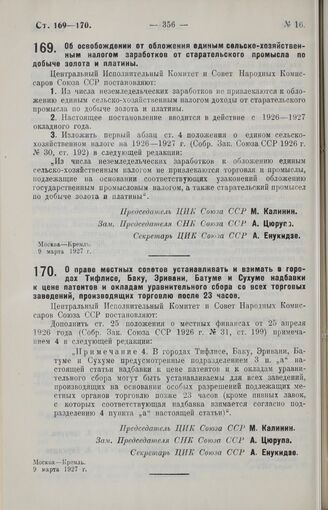 Постановление Центрального Исполнительного Комитета и Совета Народных Комиссаров. Об освобождении от обложения единым сельско-хозяйственным налогом заработков от старательского промысла по добыче золота и платины. 9 марта 1927 г.