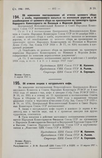Постановление Центрального Исполнительного Комитета и Совета Народных Комиссаров. Об изменении постановления об отмене целевого сбора с хлеба, перевозимого насыпью по железным дорогам, и об освобождении от целевого сбора на просвещение на транспор...