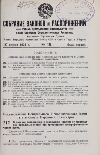 Постановление Центрального Исполнительного Комитета и Совета Народных Комиссаров. О порядке определения и возмещения убытков от повреждений земельных угодий при производстве топографо-геодезических работ. 30 марта 1927 г.
