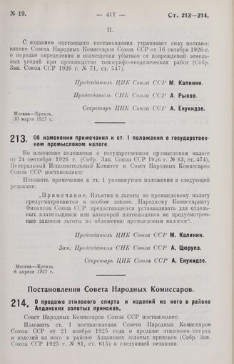 Постановление Совета Народных Комиссаров. О продаже этилового спирта и изделий из него в районе Алданских золотых приисков. 5 апреля 1927 г.