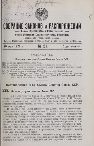 Постановление 4-го Съезда Советов Союза ССР. По отчету правительства Союза ССР. 20 апреля 1927 г.