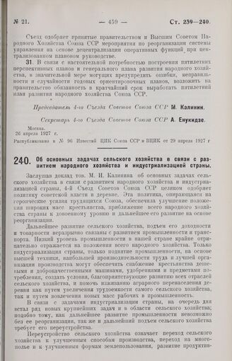 Постановление 4-го Съезда Советов Союза ССР. Об основных задачах сельского хозяйства в связи с развитием народного хозяйства и индустриализацией страны. 26 апреля 1927 г. // Распубликовано в № 96 Известий ЦИК Союза ССР и ВЦИК от 29 апреля 1927 г.