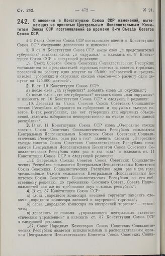 Постановление 4-го Съезда Советов Союза ССР. О внесении в Конституцию Союза ССР изменений, вытекающих из принятых Центральным Исполнительным Комитетом Союза ССР постановлений со времени 3-го Съезда Советов Союза ССР. 26 апреля 1927 г.