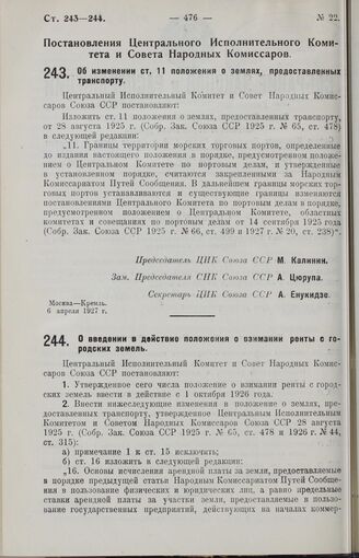 Постановление Центрального Исполнительного Комитета и Совета Народных Комиссаров. Об изменении ст. 11 положения о землях, предоставленных транспорту. 6 апреля 1927 г.