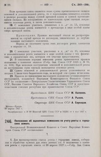 Постановление Центрального Исполнительного Комитета и Совета Народных Комиссаров. Положение об оценочных комиссиях по учету ренты с городских земель. 30 апреля 1927 г.