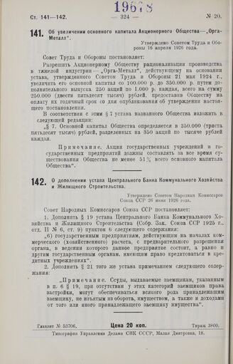 О дополнении устава Центрального Банка Коммунального Хозяйства и Жилищного Строительства. Утверждено Советом Народных Комиссаров Союза ССР 26 июня 1926 года