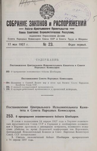 Постановление Центрального Исполнительного Комитета и Совета Народных Комиссаров. О прекращении экономического бойкота Швейцарии. 4 мая 1927 г. // Распубликовано в № 104 Известий ЦИК Союза ССР и ВЦИК от 10 мая 1927 г.