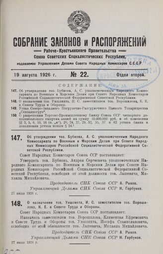 О назначении тов. Уншлихта, И. С. заместителем тов. Ворошилова, К. Е. в Совете Труда и Обороны. 27 июля 1926 г.
