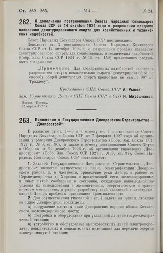 Постановление Совета Народных Комиссаров. Положение о Государственном Днепровском Строительстве — «Днепрострой». 30 апреля 1927 г.