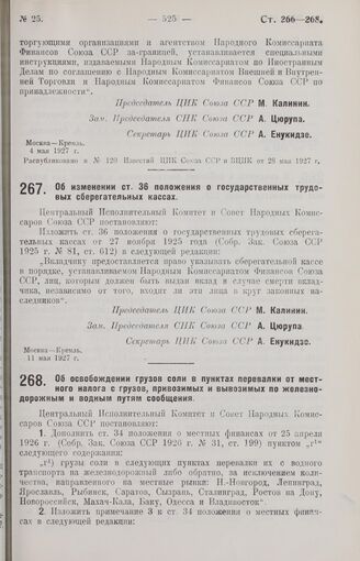 Постановление Центрального Исполнительного Комитета и Совета Народных Комиссаров. Об освобождении грузов соли в пунктах перевалки от местного налога с грузов, привозимых и вывозимых по железнодорожным и водным путям сообщения. 11 мая 1927 г.