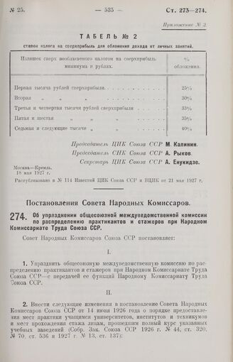 Постановление Совета Народных Комиссаров. Об упразднении общесоюзной междуведомственной комиссии по распределению практикантов и стажеров при Народном Комиссариате Труда Союза ССР. 22 апреля 1927 г.