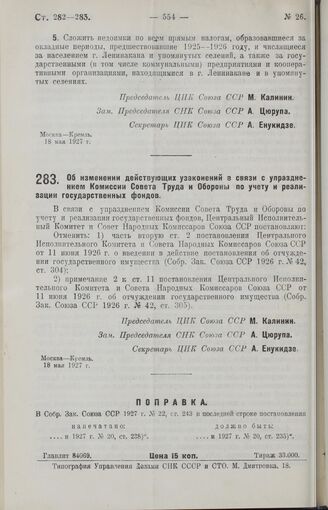 Постановление Центрального Исполнительного Комитета и Совета Народных Комиссаров. Об изменении действующих узаконений в связи с упразднением Комиссии Совета Труда и Обороны по учету и реализации государственных фондов. 18 мая 1927 г.