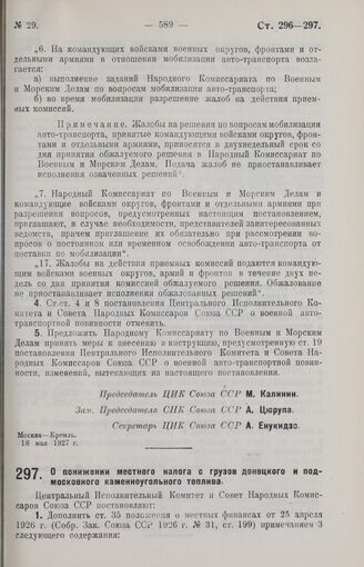 Постановление Центрального Исполнительного Комитета и Совета Народных Комиссаров. О понижении местного налога с грузов донецкого и подмосковного каменноугольного топлива. 21 мая 1927 г.
