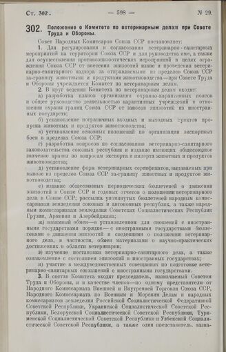 Постановление Совета Народных Комиссаров. Положение о Комитете по ветеринарным делам при Совете Труда и Обороны. 14 мая 1927 г.