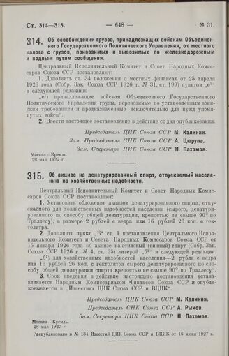 Постановление Центрального Исполнительного Комитета и Совета Народных Комиссаров. Об освобождении грузов, принадлежащих войскам Объединенного Государственного Политического Управления, от местного налога с грузов, привозимых и вывозимых по железно...