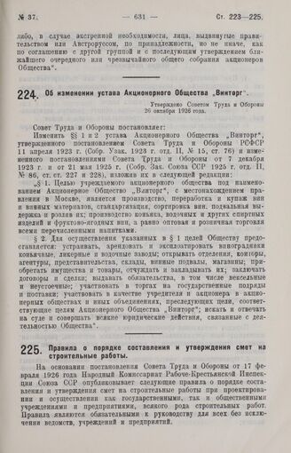 Об изменении устава Акционерного Общества «Винторг». Утверждено Советом Труда и Обороны 26 октября 1926 года