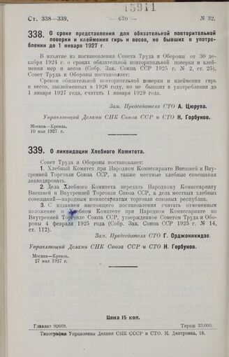 Постановление Совета Труда и Обороны. О сроке представления для обязательной повторительной поверки и клеймения гирь и весов, не бывших в употреблении до 1 января 1927 г. 10 мая 1927 г.