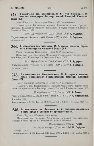 О назначении тов. Смирнова, А. И. особоуполномоченным Совета Труда и Обороны по дровозаготовкам. 12 ноября 1926 г. // Распубликовано в № 271 Известий ЦИК Союза ССР и ВЦИК от 23 ноября 1926 г.