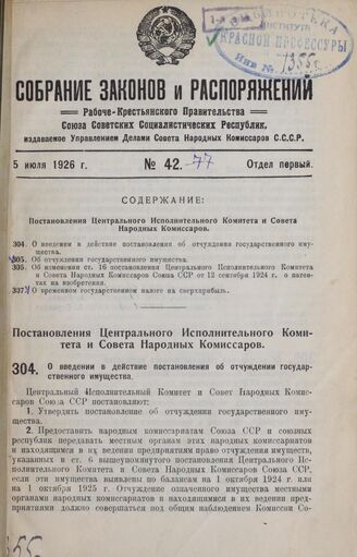 Собрание законов и распоряжений Рабоче-Крестьянского Правительства СССР за 1926 г. № 42-77. Отдел первый. — М., б. г.