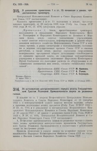 Постановление Центрального Исполнительного Комитета и Совета Народных Комиссаров. О дополнении примечания 1 к ст. 15 положения о землях, предоставленных транспорту. 25 июня 1926 г.