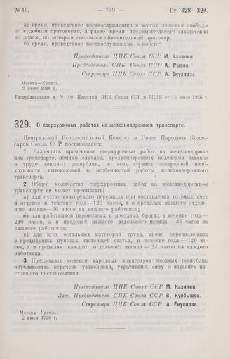 Постановление Центрального Исполнительного Комитета и Совета Народных Комиссаров. О сверхурочных работах на железнодорожном транспорте. 2 июля 1926 г.