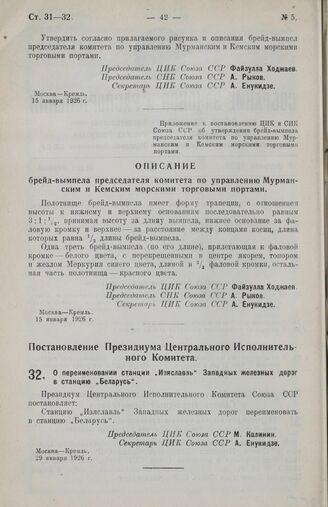 Постановление Президиума Центрального Исполнительного Комитета. О переименовании станции «Изяславль» Западных железных дорог в станцию «Беларусь». 29 января 1926 г.