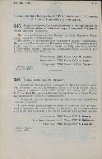Постановление Центрального Исполнительного Комитета и Совета Народных Комиссаров. О сроке введения в действие положения о государственном подоходном налоге в Ташаузском округе Туркменской Социалистической Советской Республики. 30 апреля 1926 г.