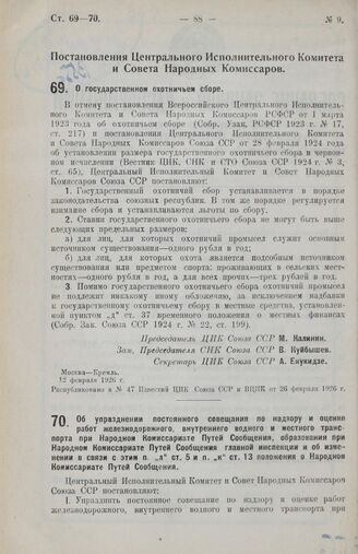 Постановление Центрального Исполнительного Комитета и Совета Народных Комиссаров. О государственном охотничьем сборе. 12 февраля 1926 г. // Распубликовано в № 47 Известий ЦИК Союза ССР и ВЦИК от 26 февраля 1926 г.