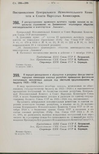 Постановление Центрального Исполнительного Комитета и Совета Народных Комиссаров. О порядке расходования и обращения в резервные фонды советов народных комиссаров союзных республик превышения фактически поступающих неналоговых доходов над сметными предположениями по бюджету 1925-1926 г. 13 августа 1926 г.