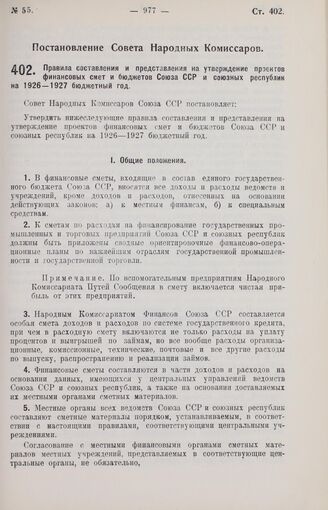Постановление Совета Народных Комиссаров. Правила составления и представления на утверждение проектов финансовых смет и бюджетов Союза ССР и союзных республик на 1926-1927 бюджетный год. 7 августа 1926 г.