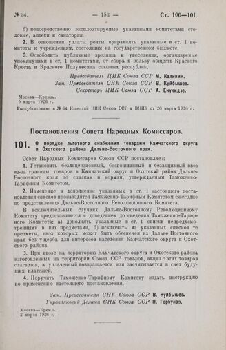 Постановление Совета Народных Комиссаров. О порядке льготного снабжения товарами Камчатского округа и Охотского района Дальне-Восточного края. 2 марта 1926 г.