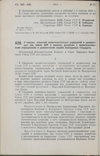 Постановление Центрального Исполнительного Комитета и Совета Народных Комиссаров. О порядке сношений правительственных учреждений и должностных лиц Союза ССР и союзных республик с правительственными учреждениями и должностными лицами иностранных государств. 27 августа 1926 г.