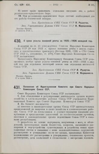Постановление Совета Народных Комиссаров. Положение об Ирригационном Комитете при Совете Народных Комиссаров Союза ССР. 17 августа 1926 г.