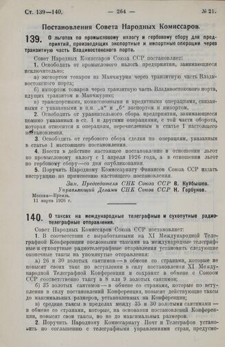 Постановление Совета Народных Комиссаров. О таксах на международные телеграфные и сухопутные радиотелеграфные отправления. 19 марта 1926 г.
