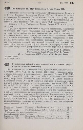 Постановление Центрального Исполнительного Комитета и Совета Народных Комиссаров. О дополнении табелей ставок основной ренты с земель городских и предоставленных транспорту. 17 сентября 1926 г.