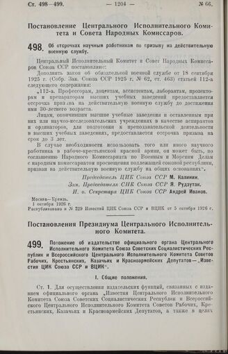 Постановление Центрального Исполнительного Комитета и Совета Народных Комиссаров. Об отсрочках научным работникам по призыву на действительную военную службу. 1 октября 1926 г.