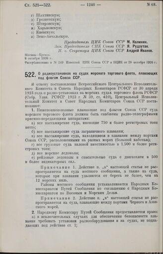 Постановление Центрального Исполнительного Комитета и Совета Народных Комиссаров. О радиоустановках на судах морского торгового флота, плавающих под флагом Союза ССР. 8 октября 1926 г.